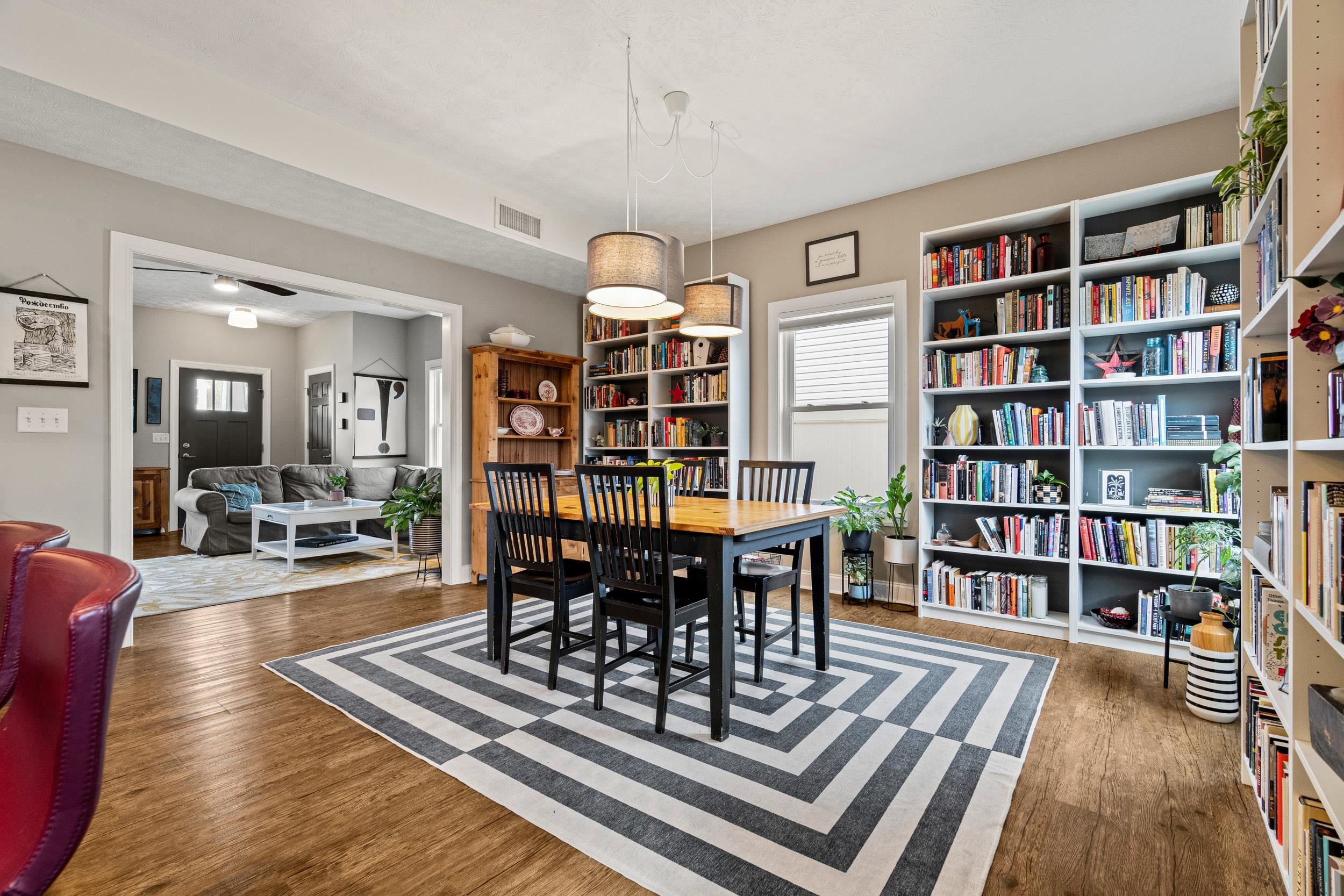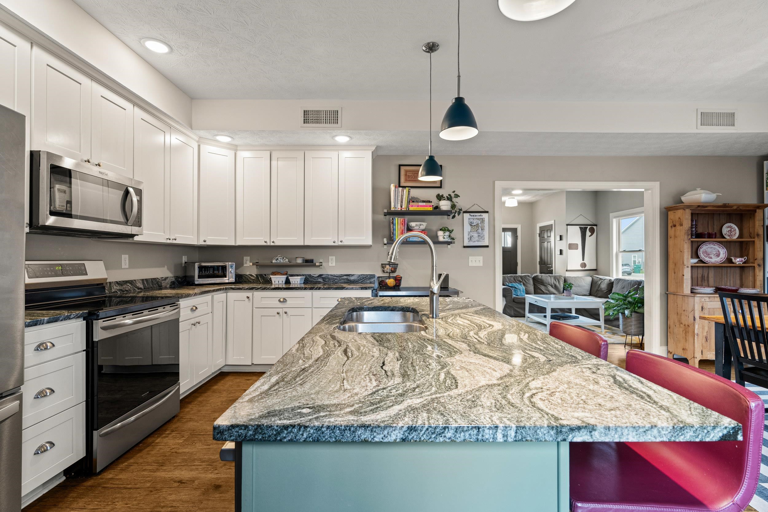 This 2019 Craftsman Cottage delivers the quality finishes and clean lines of newer construction in one of Harrisonburg's most convenient locations. A covered front porch with stacked-stone columns and a bold teal entry door open to a thoughtfully designed interior featuring luxury vinyl plank flooring throughout the main level and 9' ceilings. The open-concept kitchen flows into the dining and living spaces, anchored by white shaker cabinetry, granite countertops, a painted island with bar seating, induction range, stainless steel appliances, and statement pendant lighting. The main-level primary suite features a full bath and a walk-in closet. Upstairs offers two additional bedrooms and a full bath; a powder room serves the main level. HOA covers area maintenance and snow removal. Rear gravel patio with shade sail, string lighting, and fire pit. Minutes to EMU, downtown, JMU, and I-81.
